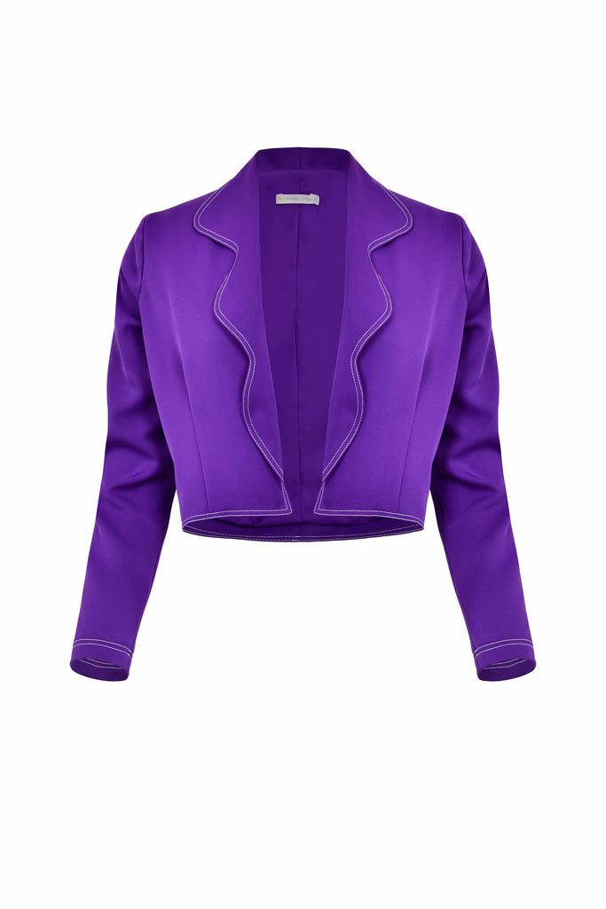 Cropped tailored blazer designed with curves along the front lapel, defined by our signature contrast stitching for a sleeker look.