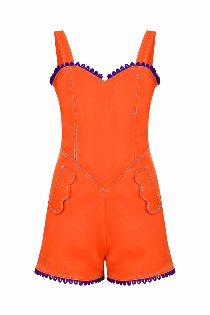 This fun and girly romper offers a heart neckline with detailing and a stunning V-typed bodice with contrast detailing on the hem as well.