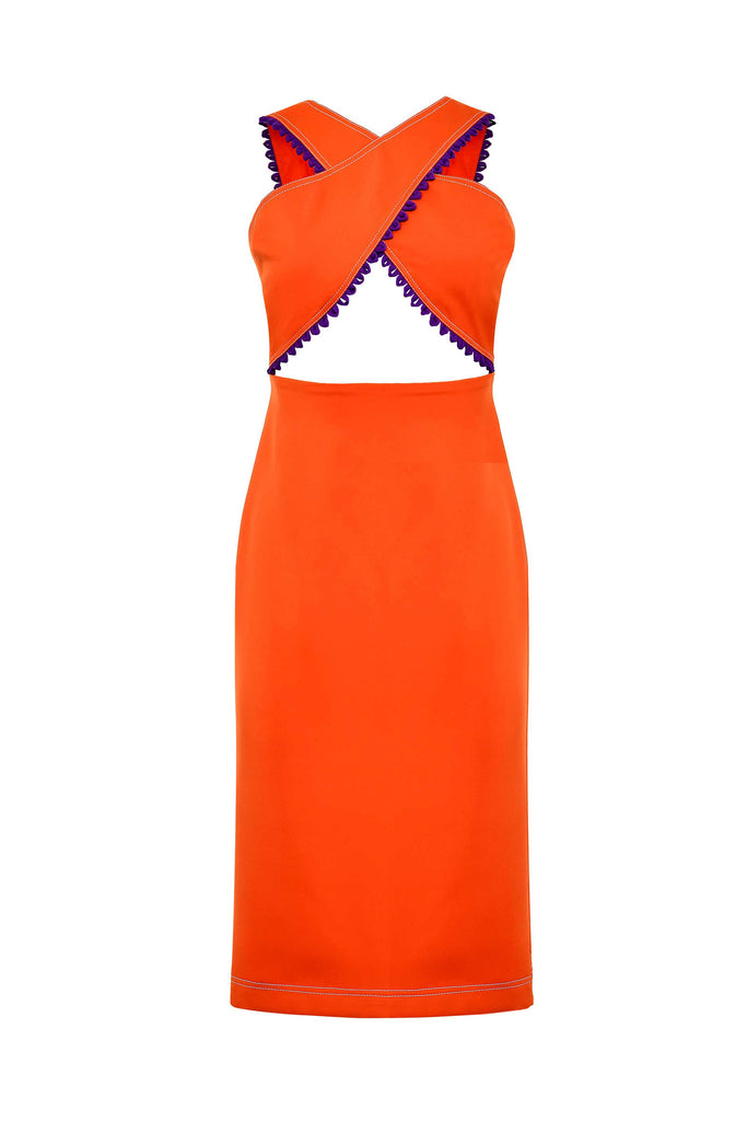 The Luna Midi Halter Dress has a playful contrast detialing, a peak-a-boo cut-out front and center and a straight structure for a fitted look.
